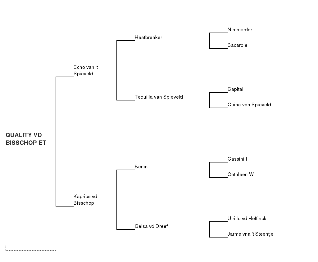 Quality vd Bisschop is a 2016 daughter of Echo van’t Spieveld, currently jumping 1m60 classes with American prodigy Victoria Colvin, and of Kaprice vd Bisschop, the promising Berlin mare that was purchased in July 2016 by Dirk Geerinckx, investor behind Belgian rider Fabrice Galdini. The famous stallions Action-Breaker and Quasimodo van de Molendreef come out of that same damline.