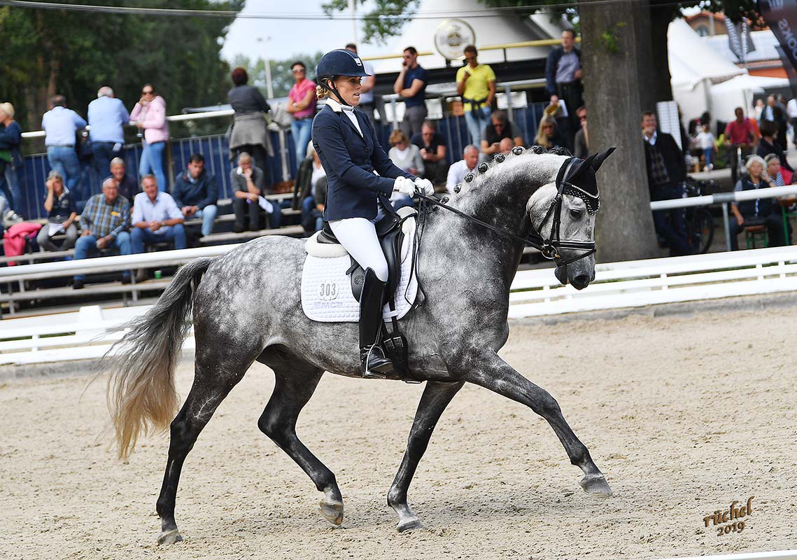 Despite Andrea’s arm fracture late June, Andrea wished to be back in the saddle to participate in the Bundeschampionate for which she was selected by winning the M Level test in Bulkau on May 31st. In just three weeks, Andrea got Di Magic back in shape and delivered great tests in Warendorf.