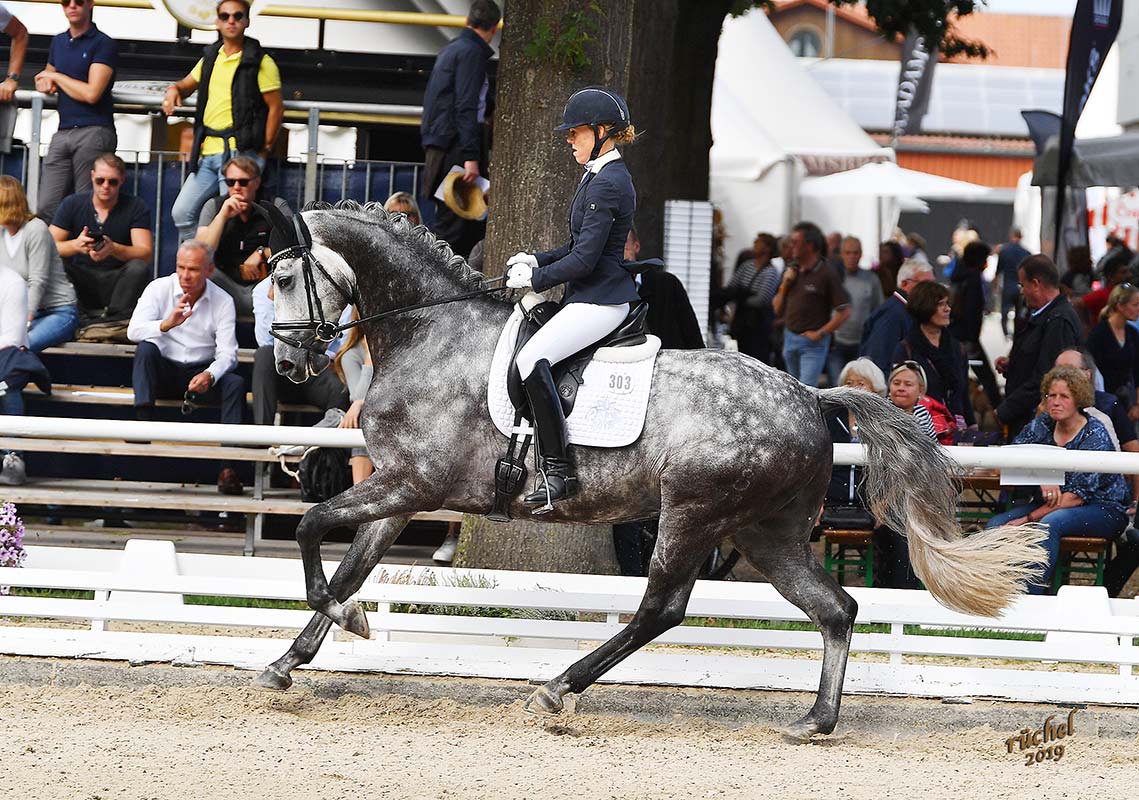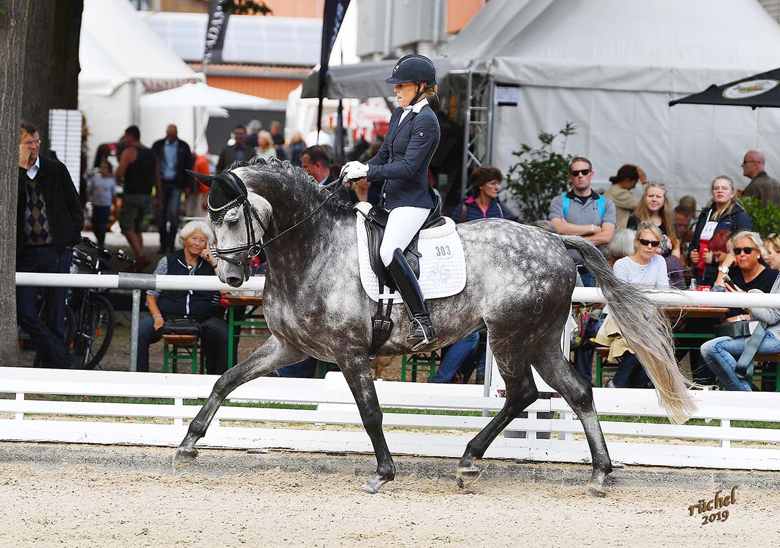 Amongst a very strong group of 44 horses, Di Magic (by Del Magico x Canaster I) and Andrea finish eighth in the Qualifier for the Finale of the Bundeschampionate (German Championship) for 6 Years Old Horses with an overall score of 8,0. Di Magic got the highest score in the walk of the day, being awarded an 9,5!
