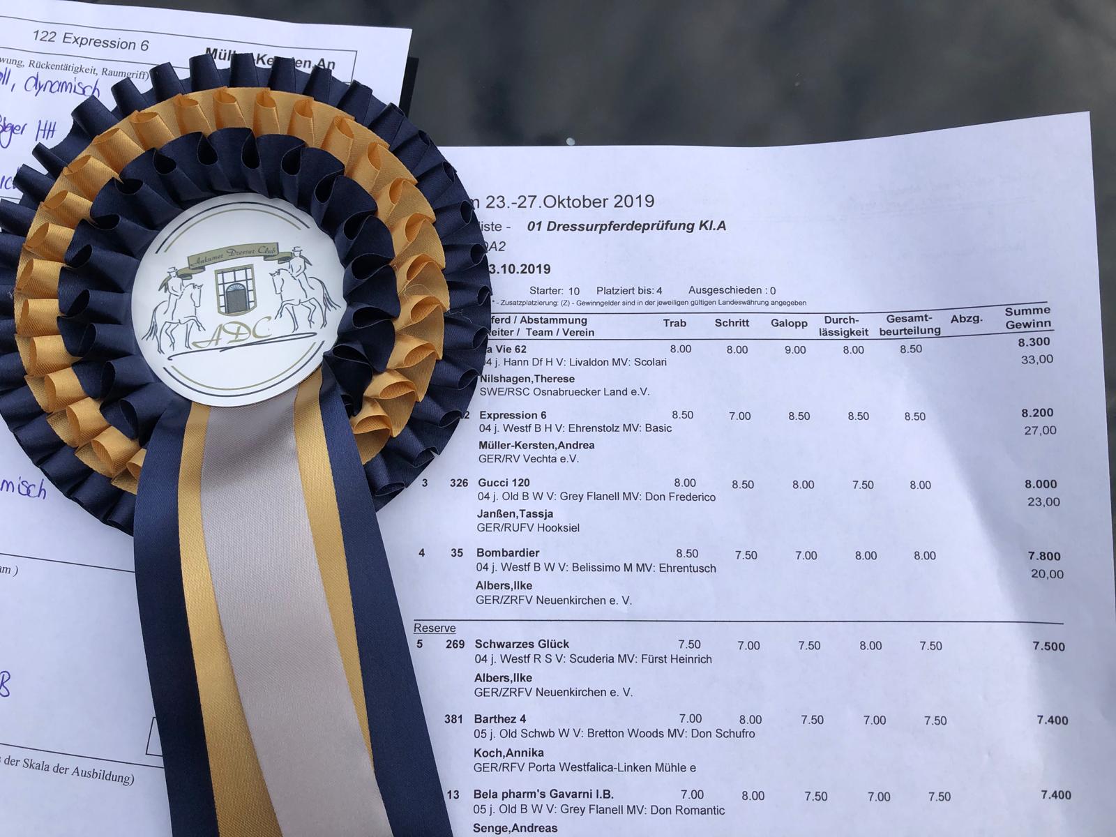 CompetitionOn October 23, 2019, Andrea presented Expression (by Ehrenstolz x Basic) in Ankum, Germany. They achieved the score of 8,2 (8,5 in trot, canter, submission and perspective) and obtained the second place right behind Therese Nilshagen with the Lodbergen stallion La Vie.